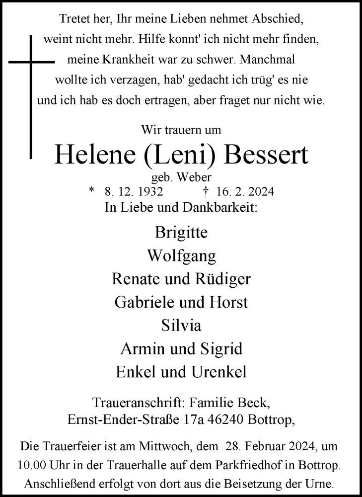 Hier finden Sie alle Traueranzeigen aus der Zeitung, die bisher für Helene Bessert erschienen sind. Weitere Traueranzeigen, die in der Zeitung erscheinen, werden hier ebenfalls aufgelistet