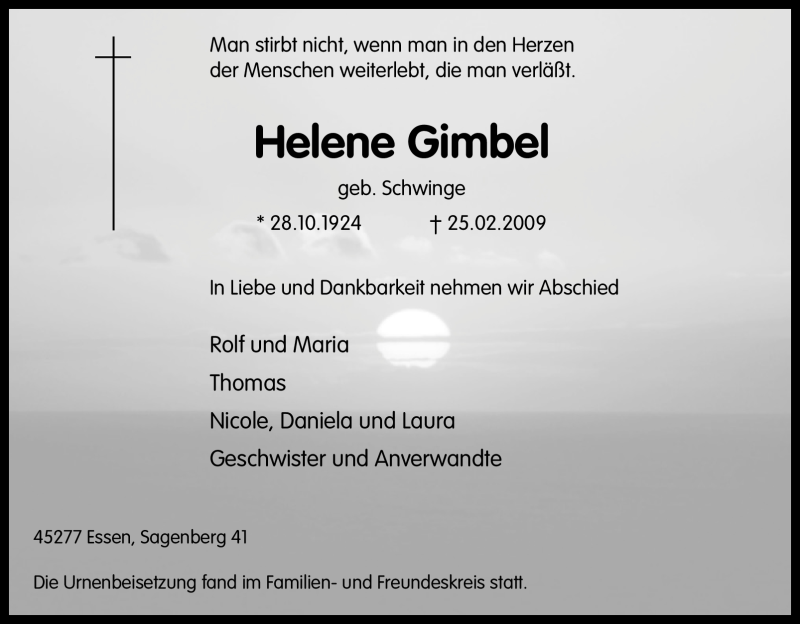 Hier finden Sie alle Traueranzeigen aus der Zeitung, die bisher für Helene Gimbel erschienen sind. Weitere Traueranzeigen, die in der Zeitung erscheinen, werden hier ebenfalls aufgelistet