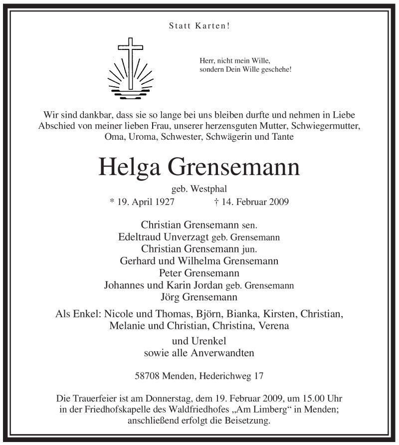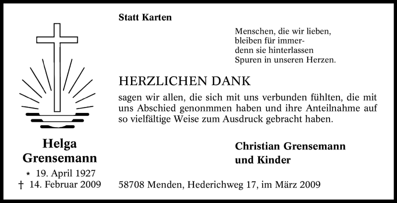Hier finden Sie alle Traueranzeigen aus der Zeitung, die bisher für Helga Grensemann erschienen sind. Weitere Traueranzeigen, die in der Zeitung erscheinen, werden hier ebenfalls aufgelistet