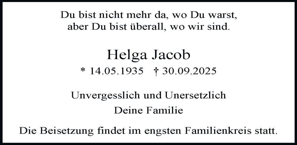 Hier finden Sie alle Traueranzeigen aus der Zeitung, die bisher für Helga Jacob erschienen sind. Weitere Traueranzeigen, die in der Zeitung erscheinen, werden hier ebenfalls aufgelistet