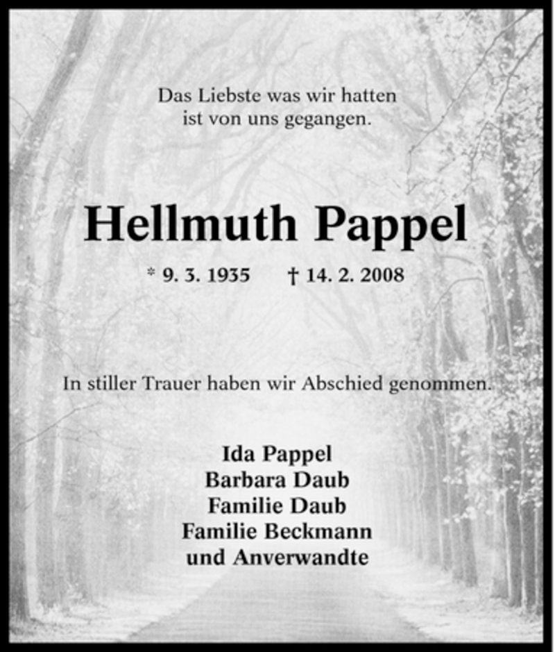 Hier finden Sie alle Traueranzeigen aus der Zeitung, die bisher für Hellmuth Pappel erschienen sind. Weitere Traueranzeigen, die in der Zeitung erscheinen, werden hier ebenfalls aufgelistet