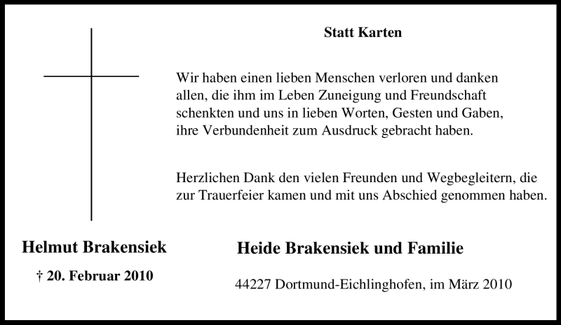 Hier finden Sie alle Traueranzeigen aus der Zeitung, die bisher für Helmut Brakensiek erschienen sind. Weitere Traueranzeigen, die in der Zeitung erscheinen, werden hier ebenfalls aufgelistet