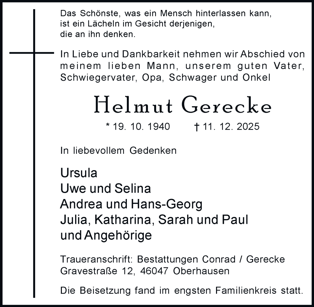 Hier finden Sie alle Traueranzeigen aus der Zeitung, die bisher für Helmut Gerecke erschienen sind. Weitere Traueranzeigen, die in der Zeitung erscheinen, werden hier ebenfalls aufgelistet