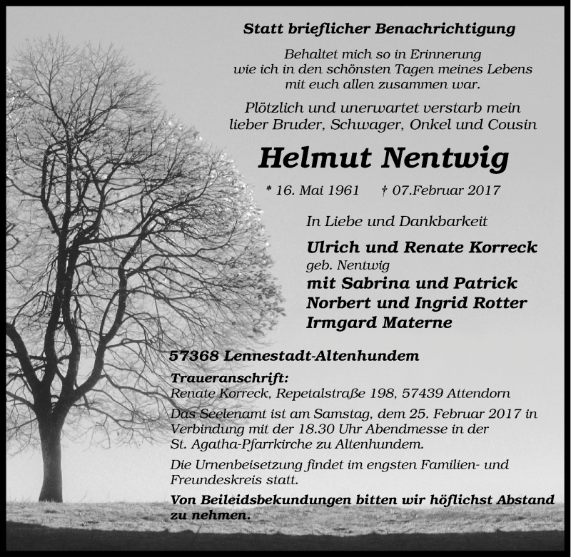 Hier finden Sie alle Traueranzeigen aus der Zeitung, die bisher für Helmut Nentwig erschienen sind. Weitere Traueranzeigen, die in der Zeitung erscheinen, werden hier ebenfalls aufgelistet