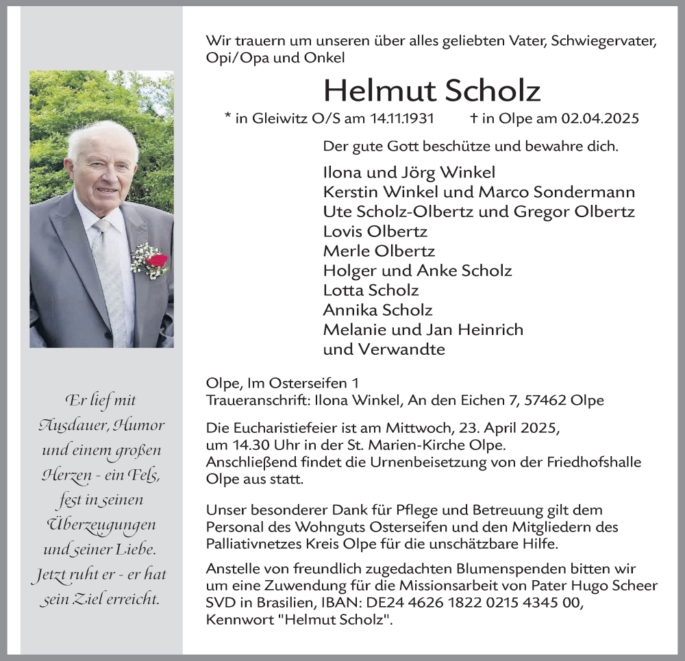 Hier finden Sie alle Traueranzeigen aus der Zeitung, die bisher für Helmut Scholz erschienen sind. Weitere Traueranzeigen, die in der Zeitung erscheinen, werden hier ebenfalls aufgelistet