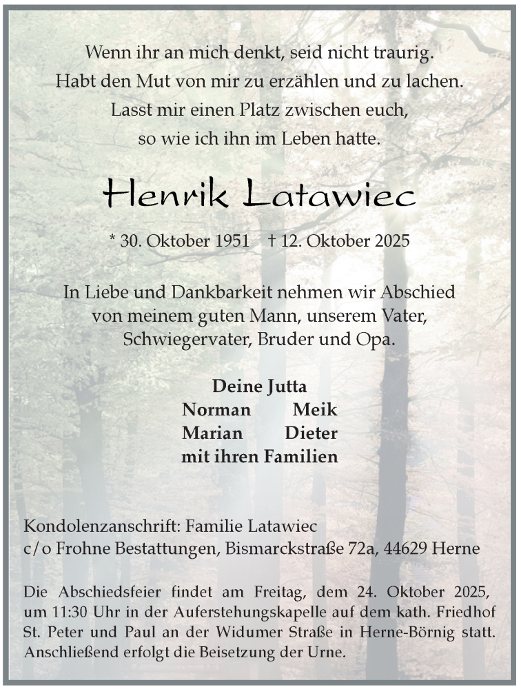 Hier finden Sie alle Traueranzeigen aus der Zeitung, die bisher für Henrik Latawiec erschienen sind. Weitere Traueranzeigen, die in der Zeitung erscheinen, werden hier ebenfalls aufgelistet
