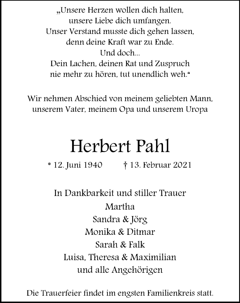 Hier finden Sie alle Traueranzeigen aus der Zeitung, die bisher für Herbert Pahl erschienen sind. Weitere Traueranzeigen, die in der Zeitung erscheinen, werden hier ebenfalls aufgelistet