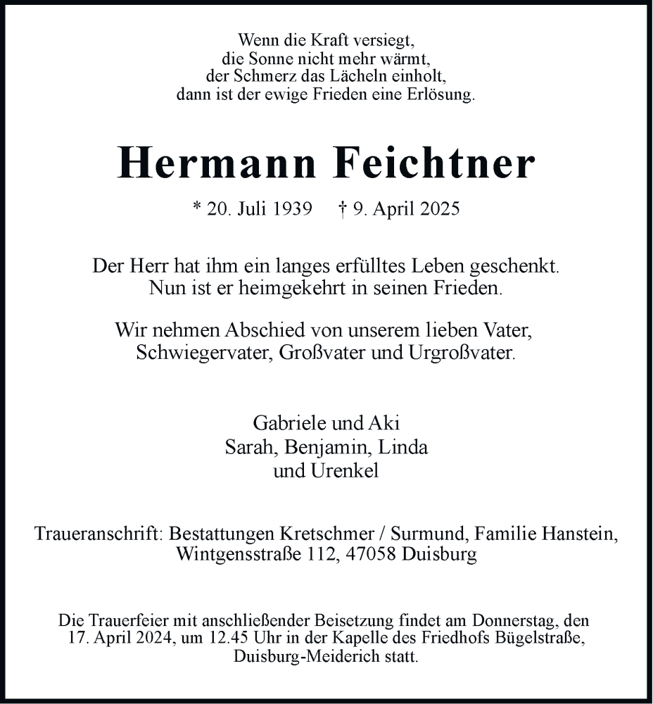 Hier finden Sie alle Traueranzeigen aus der Zeitung, die bisher für Hermann Feichtner erschienen sind. Weitere Traueranzeigen, die in der Zeitung erscheinen, werden hier ebenfalls aufgelistet