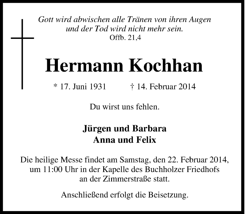 Hier finden Sie alle Traueranzeigen aus der Zeitung, die bisher für Hermann Kochhan erschienen sind. Weitere Traueranzeigen, die in der Zeitung erscheinen, werden hier ebenfalls aufgelistet
