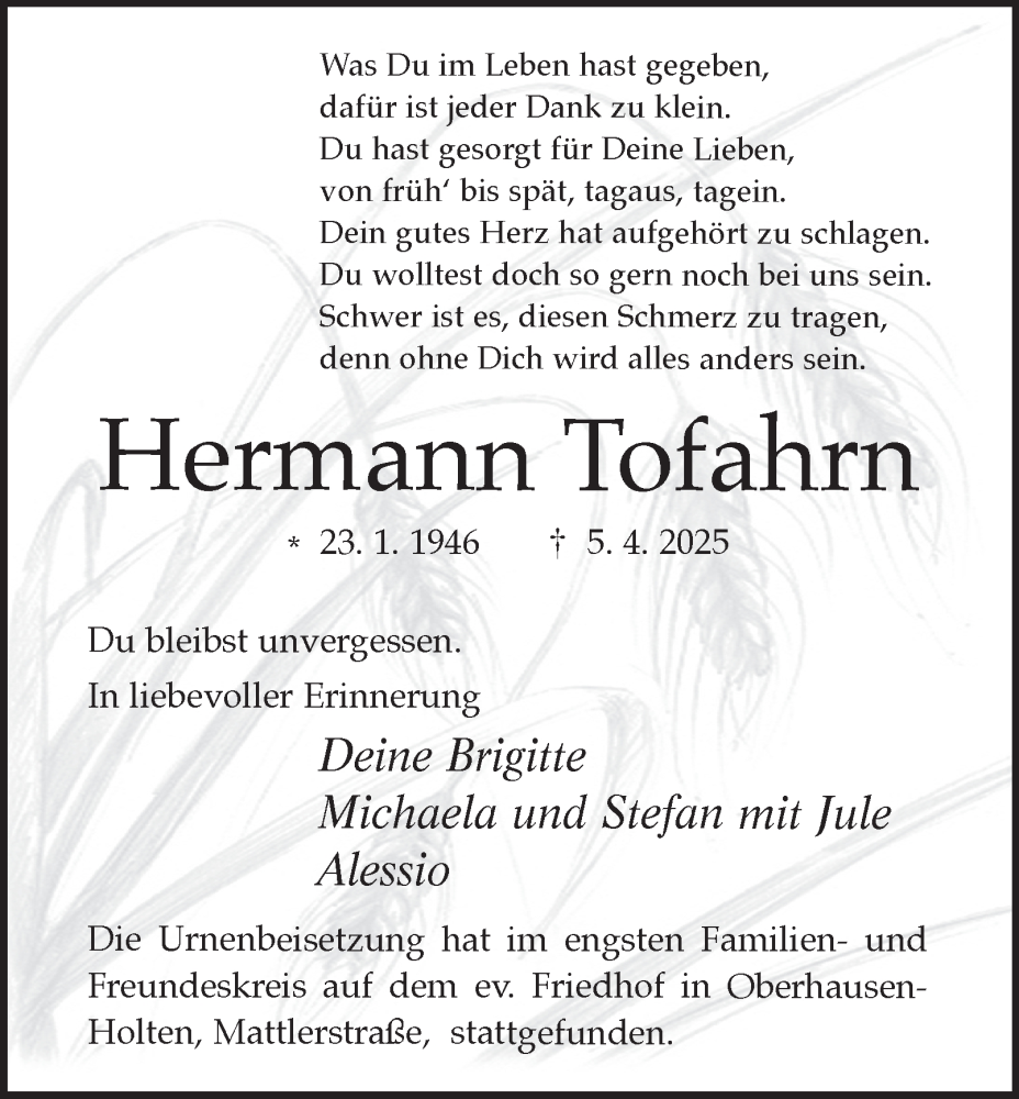 Hier finden Sie alle Traueranzeigen aus der Zeitung, die bisher für Hermann Tofahrn erschienen sind. Weitere Traueranzeigen, die in der Zeitung erscheinen, werden hier ebenfalls aufgelistet