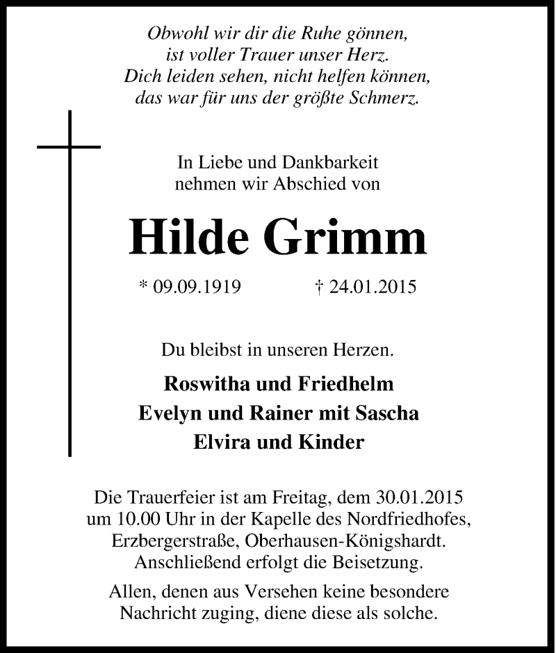 Hier finden Sie alle Traueranzeigen aus der Zeitung, die bisher für Hilde Grimm erschienen sind. Weitere Traueranzeigen, die in der Zeitung erscheinen, werden hier ebenfalls aufgelistet