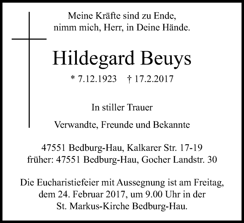 Hier finden Sie alle Traueranzeigen aus der Zeitung, die bisher für Hildegard Beuys erschienen sind. Weitere Traueranzeigen, die in der Zeitung erscheinen, werden hier ebenfalls aufgelistet