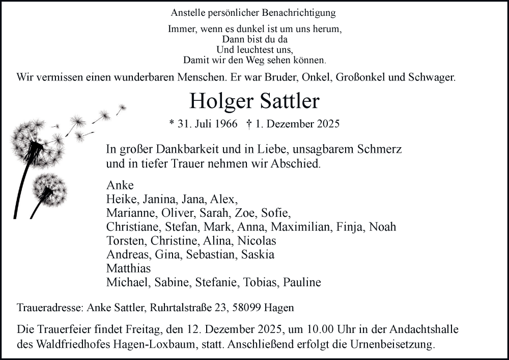 Hier finden Sie alle Traueranzeigen aus der Zeitung, die bisher für Holger Sattler erschienen sind. Weitere Traueranzeigen, die in der Zeitung erscheinen, werden hier ebenfalls aufgelistet