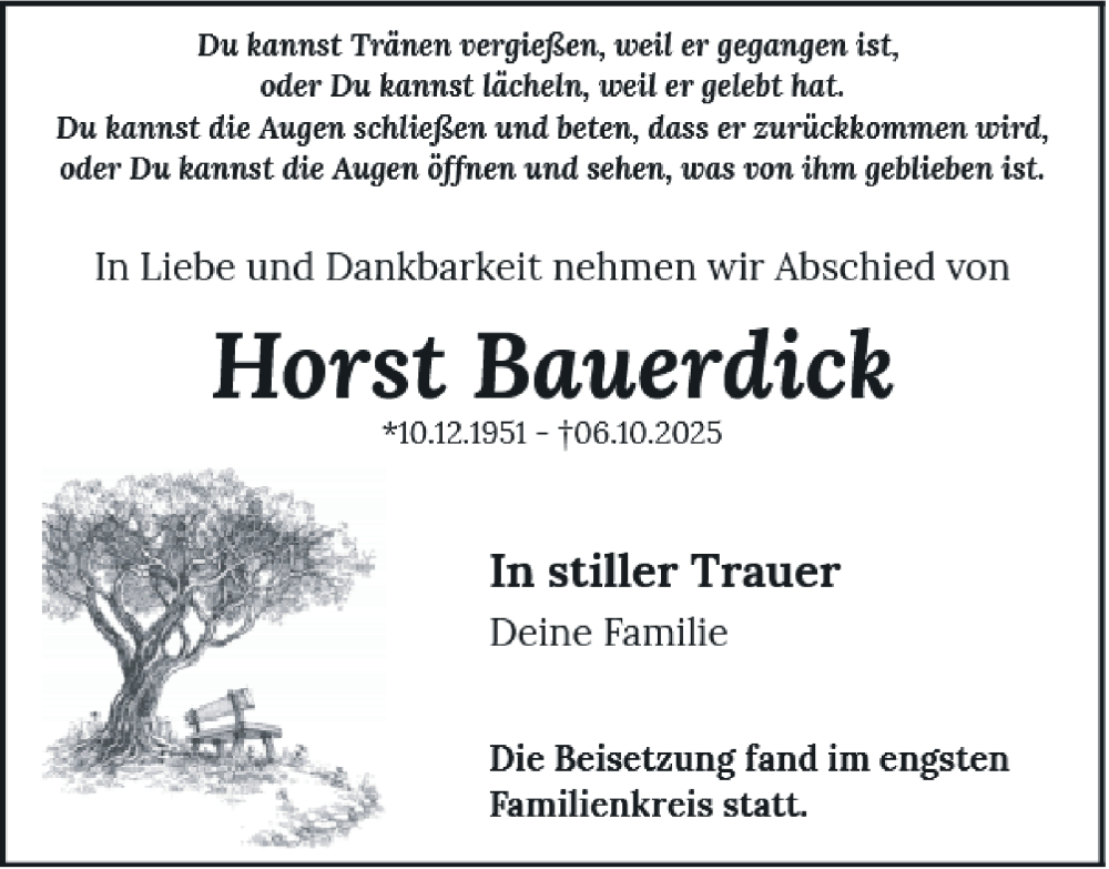Hier finden Sie alle Traueranzeigen aus der Zeitung, die bisher für Horst Bauerdick erschienen sind. Weitere Traueranzeigen, die in der Zeitung erscheinen, werden hier ebenfalls aufgelistet