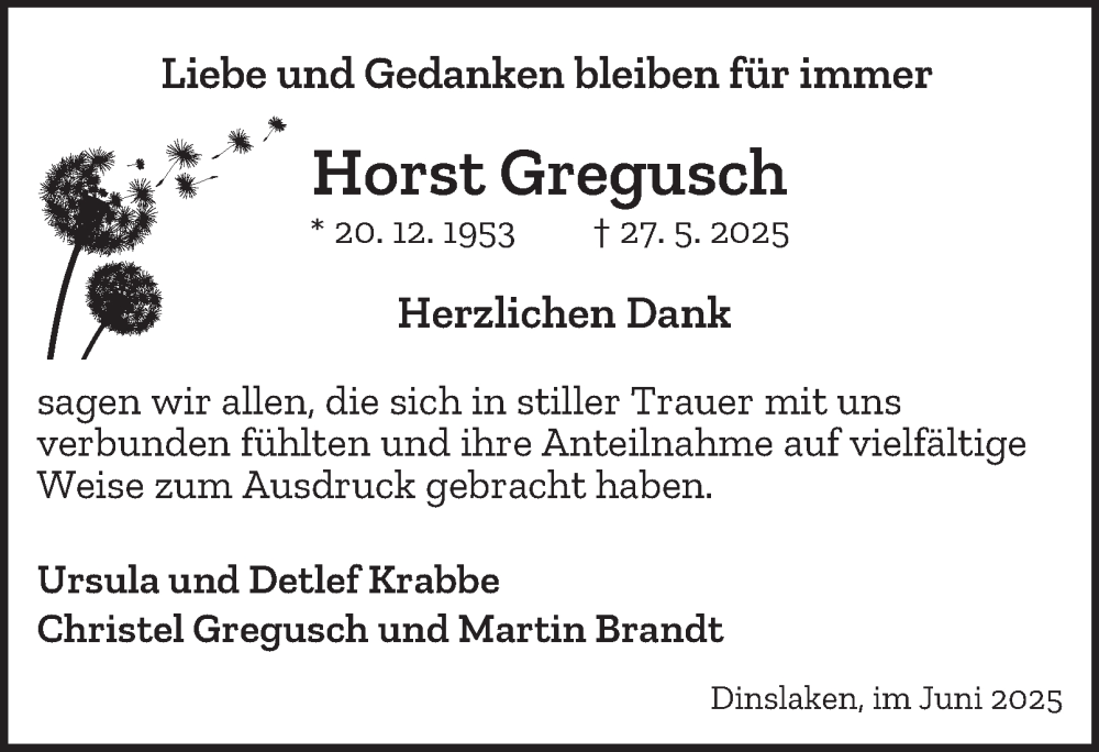Hier finden Sie alle Traueranzeigen aus der Zeitung, die bisher für Horst Gregusch erschienen sind. Weitere Traueranzeigen, die in der Zeitung erscheinen, werden hier ebenfalls aufgelistet