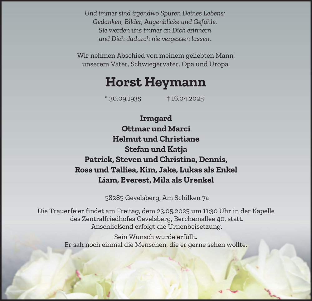 Hier finden Sie alle Traueranzeigen aus der Zeitung, die bisher für Horst Heymann erschienen sind. Weitere Traueranzeigen, die in der Zeitung erscheinen, werden hier ebenfalls aufgelistet