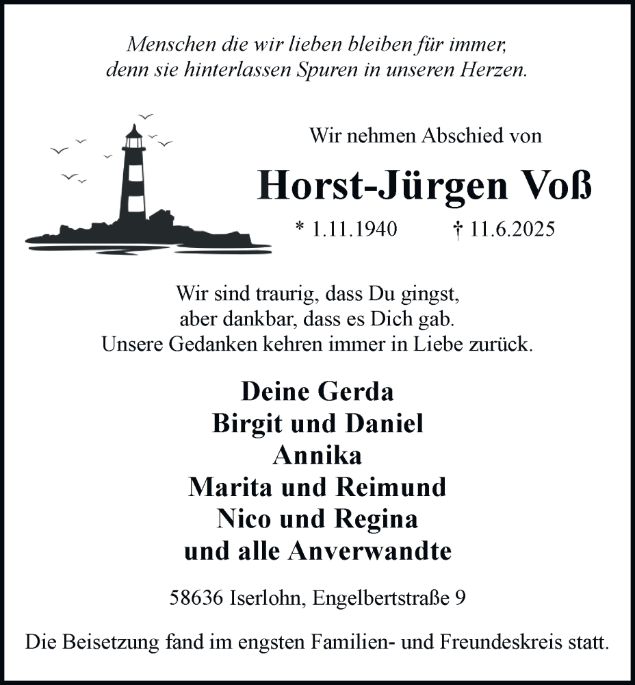 Hier finden Sie alle Traueranzeigen aus der Zeitung, die bisher für Horst-Jürgen Voß erschienen sind. Weitere Traueranzeigen, die in der Zeitung erscheinen, werden hier ebenfalls aufgelistet