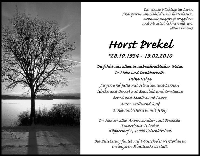 Hier finden Sie alle Traueranzeigen aus der Zeitung, die bisher für Horst Prekel erschienen sind. Weitere Traueranzeigen, die in der Zeitung erscheinen, werden hier ebenfalls aufgelistet