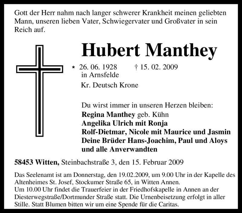 Hier finden Sie alle Traueranzeigen aus der Zeitung, die bisher für Hubert Manthey erschienen sind. Weitere Traueranzeigen, die in der Zeitung erscheinen, werden hier ebenfalls aufgelistet