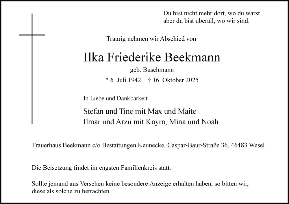 Hier finden Sie alle Traueranzeigen aus der Zeitung, die bisher für Ilka Friederike Beekmann erschienen sind. Weitere Traueranzeigen, die in der Zeitung erscheinen, werden hier ebenfalls aufgelistet