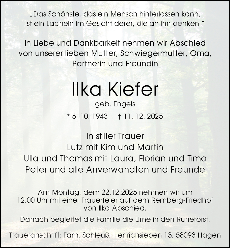 Hier finden Sie alle Traueranzeigen aus der Zeitung, die bisher für Ilka Kiefer erschienen sind. Weitere Traueranzeigen, die in der Zeitung erscheinen, werden hier ebenfalls aufgelistet