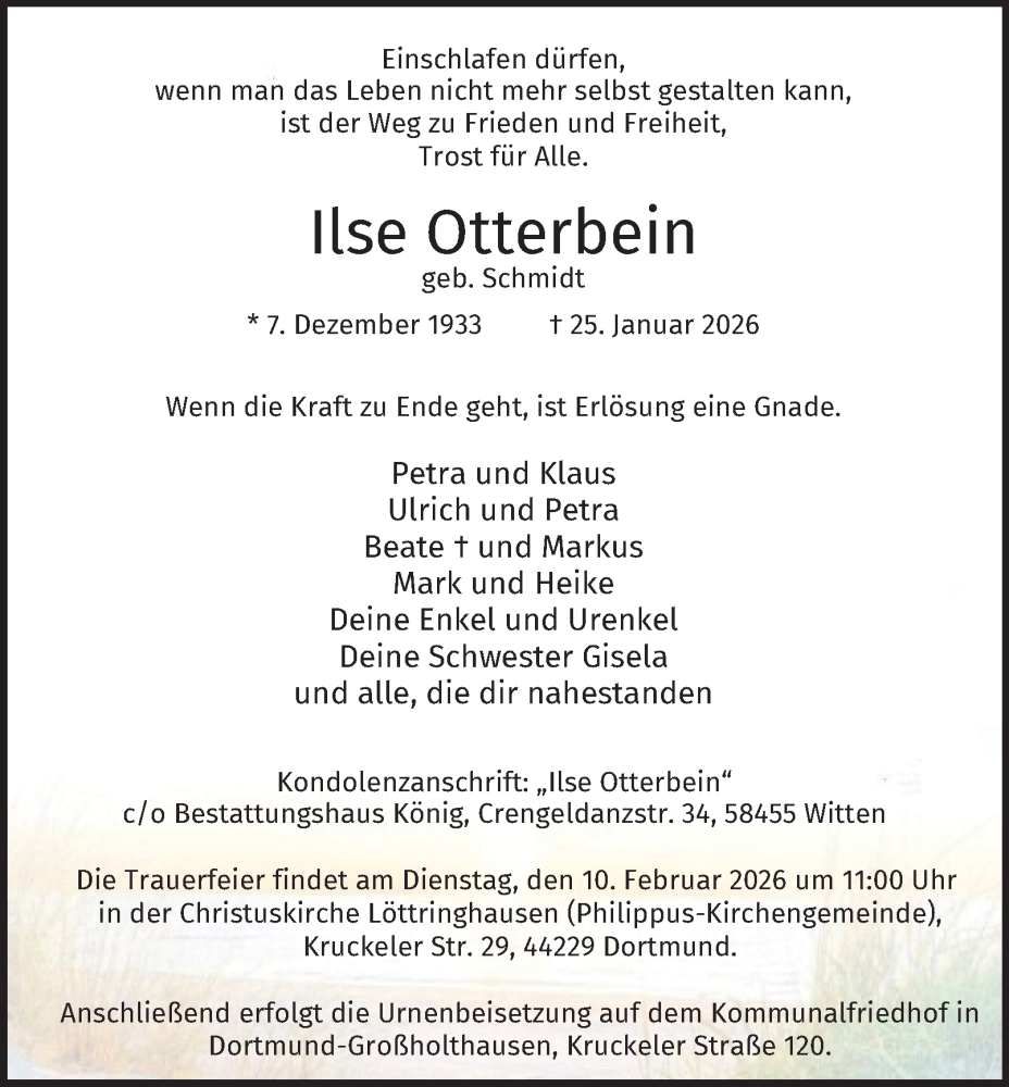 Hier finden Sie alle Traueranzeigen aus der Zeitung, die bisher für Ilse Otterbein erschienen sind. Weitere Traueranzeigen, die in der Zeitung erscheinen, werden hier ebenfalls aufgelistet