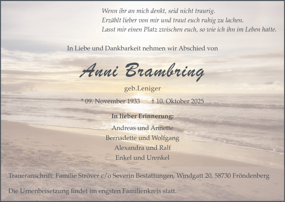 Hier finden Sie alle Traueranzeigen aus der Zeitung, die bisher für Inge Brambring erschienen sind. Weitere Traueranzeigen, die in der Zeitung erscheinen, werden hier ebenfalls aufgelistet