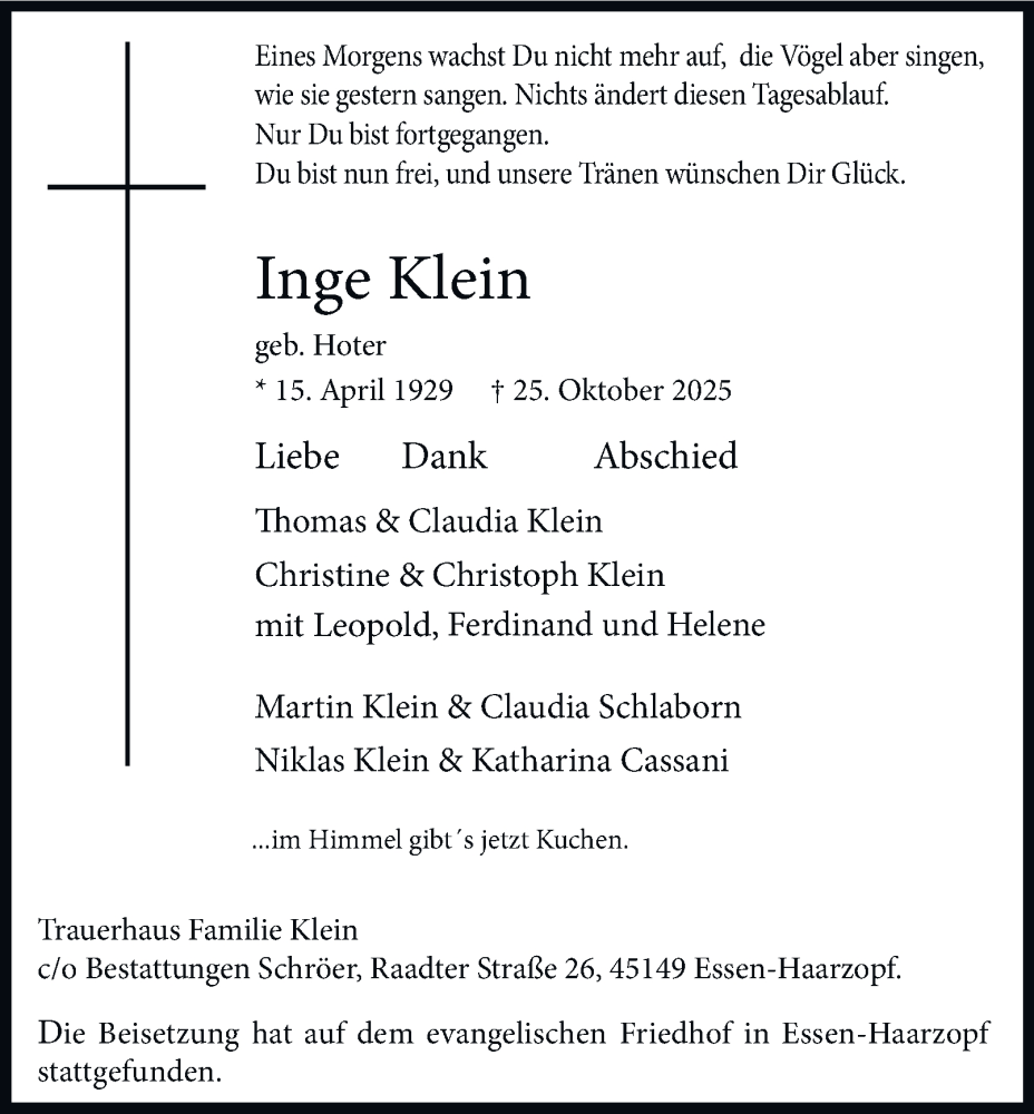 Hier finden Sie alle Traueranzeigen aus der Zeitung, die bisher für Inge Klein erschienen sind. Weitere Traueranzeigen, die in der Zeitung erscheinen, werden hier ebenfalls aufgelistet