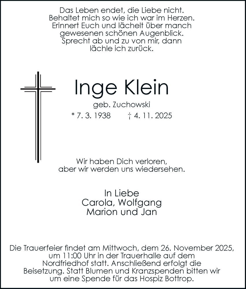 Hier finden Sie alle Traueranzeigen aus der Zeitung, die bisher für Inge Klein erschienen sind. Weitere Traueranzeigen, die in der Zeitung erscheinen, werden hier ebenfalls aufgelistet