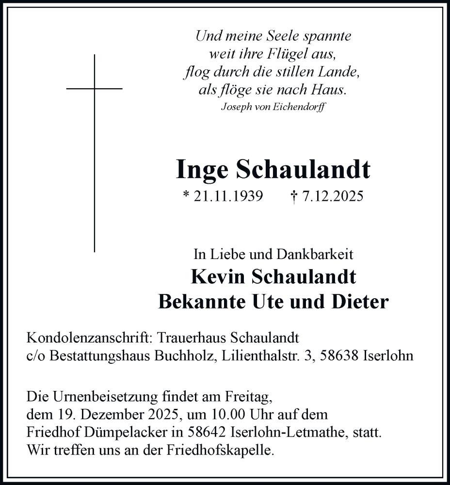 Hier finden Sie alle Traueranzeigen aus der Zeitung, die bisher für Inge Schaulandt erschienen sind. Weitere Traueranzeigen, die in der Zeitung erscheinen, werden hier ebenfalls aufgelistet