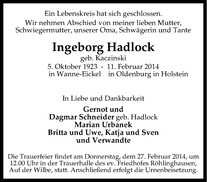 Hier finden Sie alle Traueranzeigen aus der Zeitung, die bisher für Ingeborg Hadlock erschienen sind. Weitere Traueranzeigen, die in der Zeitung erscheinen, werden hier ebenfalls aufgelistet