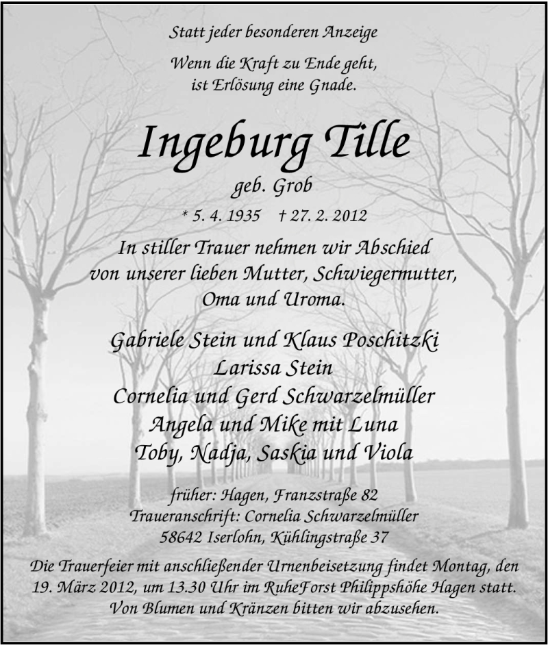 Hier finden Sie alle Traueranzeigen aus der Zeitung, die bisher für Ingeburg Tille erschienen sind. Weitere Traueranzeigen, die in der Zeitung erscheinen, werden hier ebenfalls aufgelistet