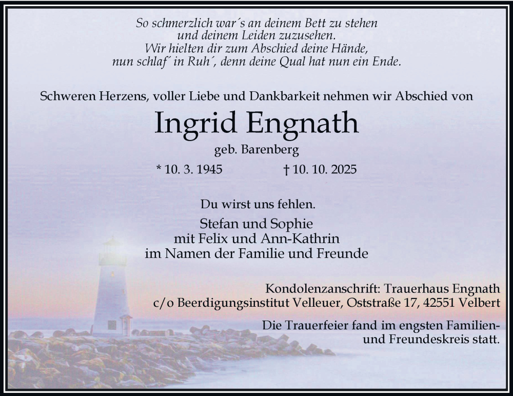 Hier finden Sie alle Traueranzeigen aus der Zeitung, die bisher für Ingrid Engnath erschienen sind. Weitere Traueranzeigen, die in der Zeitung erscheinen, werden hier ebenfalls aufgelistet