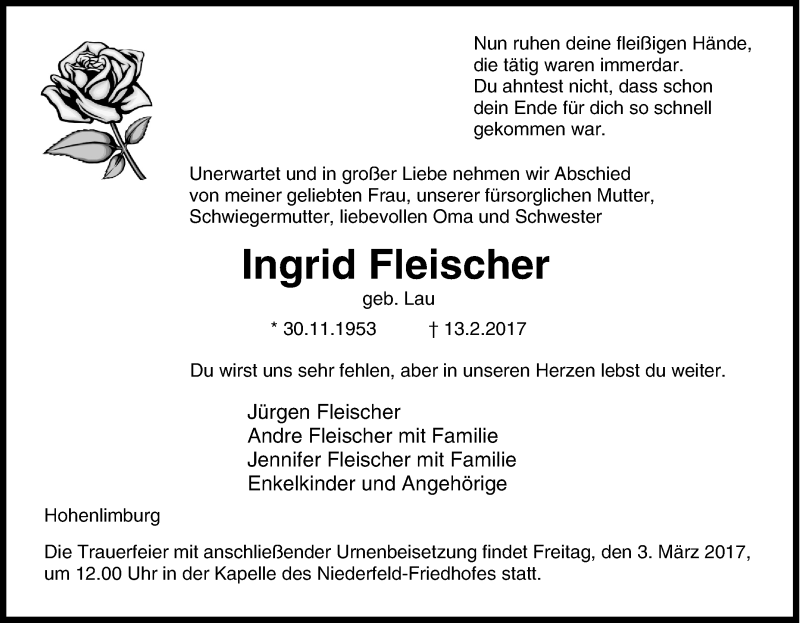 Hier finden Sie alle Traueranzeigen aus der Zeitung, die bisher für Ingrid Fleischer erschienen sind. Weitere Traueranzeigen, die in der Zeitung erscheinen, werden hier ebenfalls aufgelistet