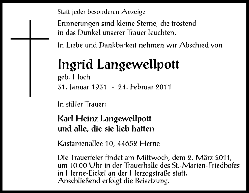 Hier finden Sie alle Traueranzeigen aus der Zeitung, die bisher für Ingrid Langewellpott erschienen sind. Weitere Traueranzeigen, die in der Zeitung erscheinen, werden hier ebenfalls aufgelistet