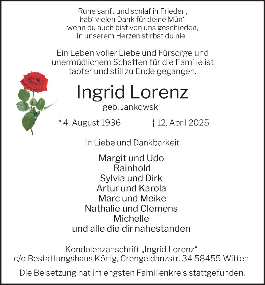 Hier finden Sie alle Traueranzeigen aus der Zeitung, die bisher für Ingrid Lorenz erschienen sind. Weitere Traueranzeigen, die in der Zeitung erscheinen, werden hier ebenfalls aufgelistet