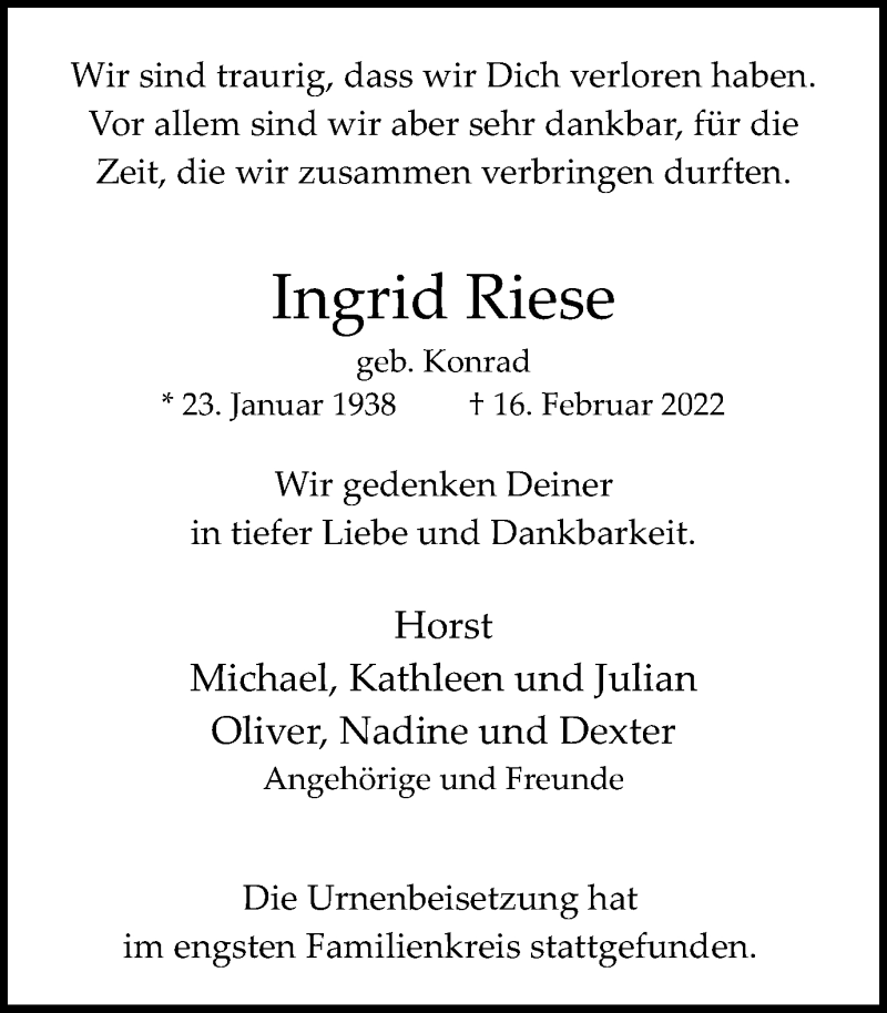 Hier finden Sie alle Traueranzeigen aus der Zeitung, die bisher für Ingrid Riese erschienen sind. Weitere Traueranzeigen, die in der Zeitung erscheinen, werden hier ebenfalls aufgelistet