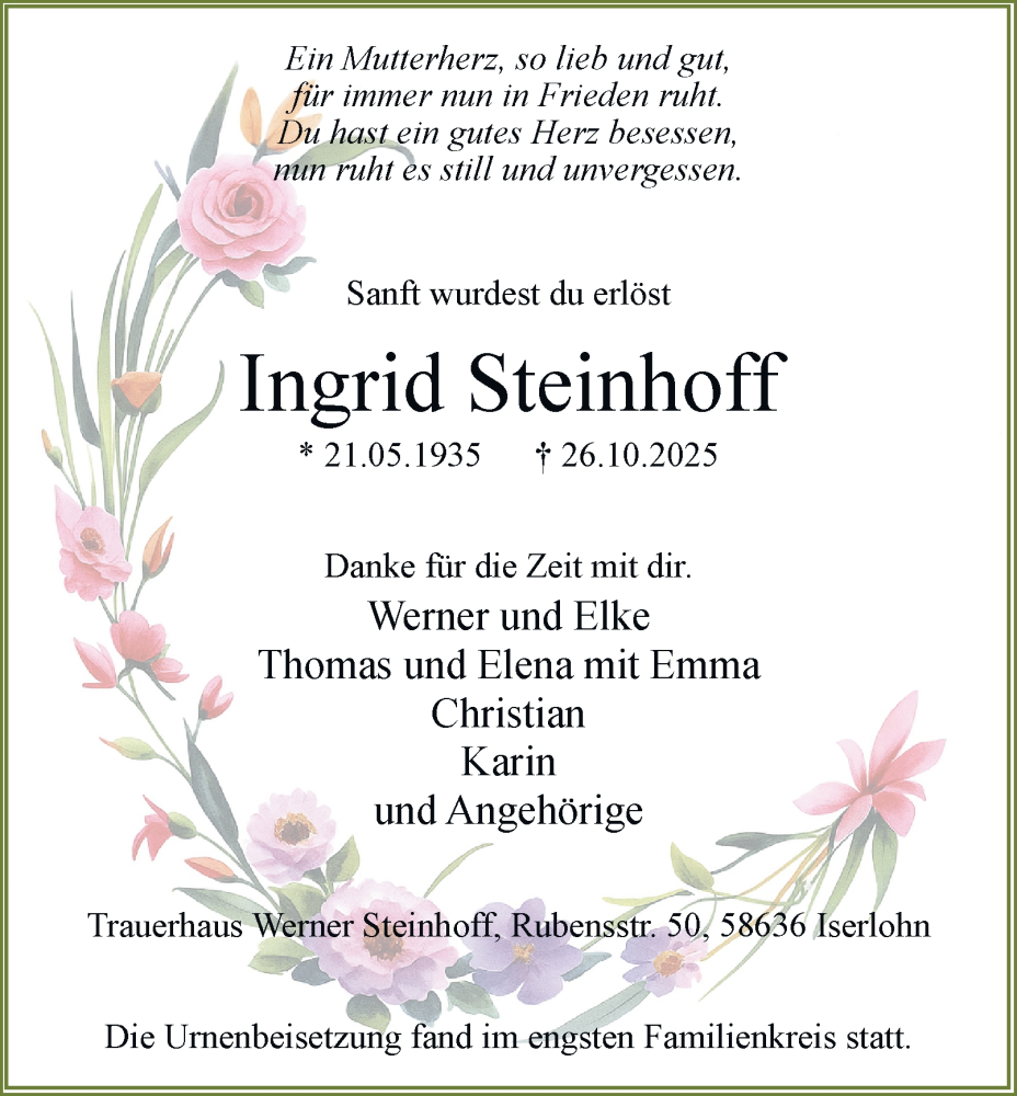 Hier finden Sie alle Traueranzeigen aus der Zeitung, die bisher für Ingrid Steinhoff erschienen sind. Weitere Traueranzeigen, die in der Zeitung erscheinen, werden hier ebenfalls aufgelistet