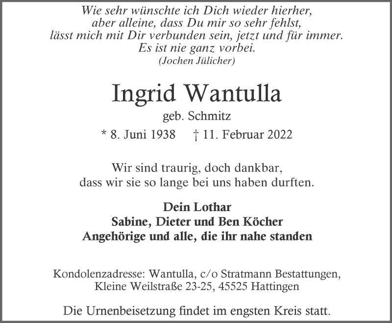 Hier finden Sie alle Traueranzeigen aus der Zeitung, die bisher für Ingrid Wantulla erschienen sind. Weitere Traueranzeigen, die in der Zeitung erscheinen, werden hier ebenfalls aufgelistet