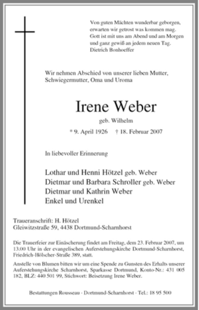 Hier finden Sie alle Traueranzeigen aus der Zeitung, die bisher für Irene Weber erschienen sind. Weitere Traueranzeigen, die in der Zeitung erscheinen, werden hier ebenfalls aufgelistet