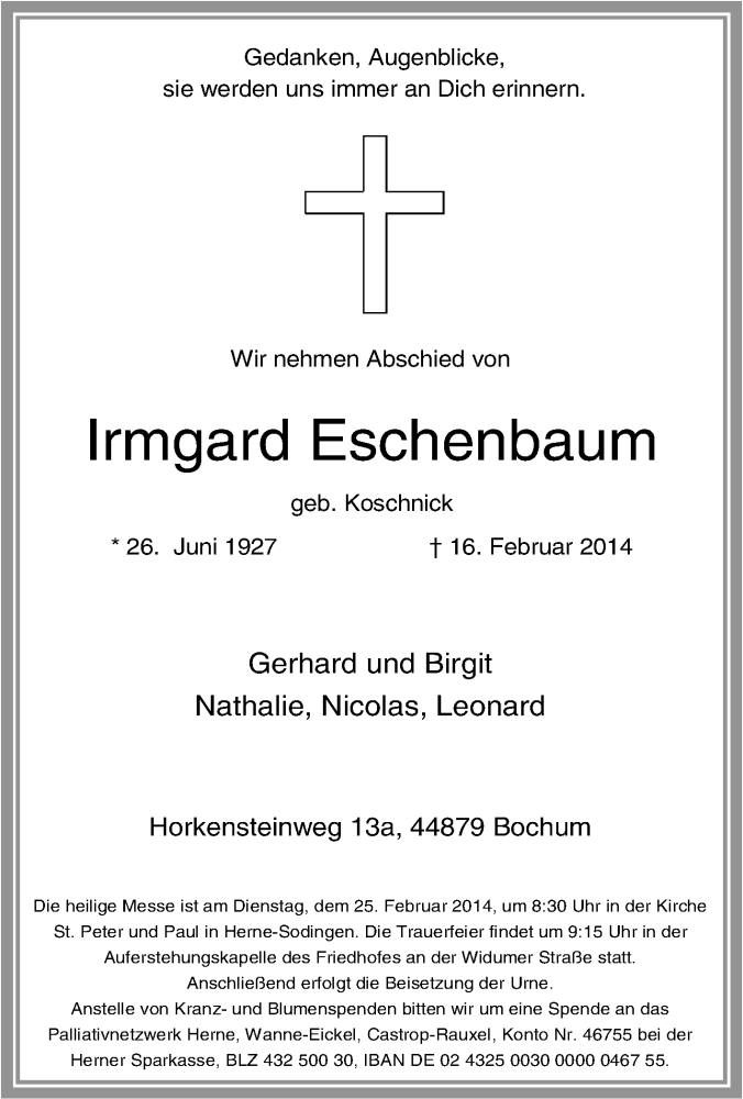 Hier finden Sie alle Traueranzeigen aus der Zeitung, die bisher für Irmgard Eschenbaum erschienen sind. Weitere Traueranzeigen, die in der Zeitung erscheinen, werden hier ebenfalls aufgelistet