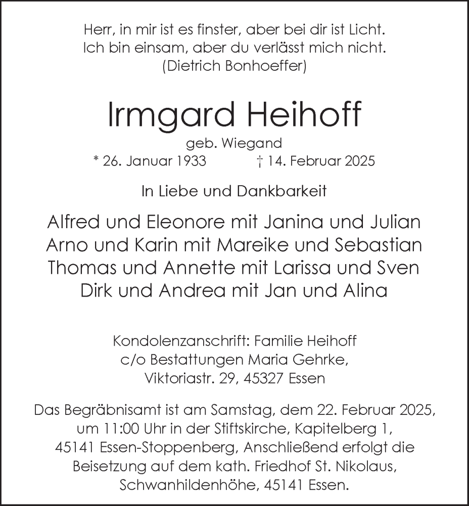 Hier finden Sie alle Traueranzeigen aus der Zeitung, die bisher für Irmgard Heihoff erschienen sind. Weitere Traueranzeigen, die in der Zeitung erscheinen, werden hier ebenfalls aufgelistet