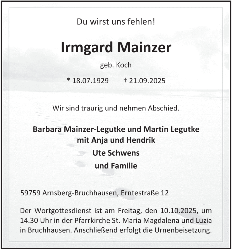 Hier finden Sie alle Traueranzeigen aus der Zeitung, die bisher für Irmgard Mainzer erschienen sind. Weitere Traueranzeigen, die in der Zeitung erscheinen, werden hier ebenfalls aufgelistet
