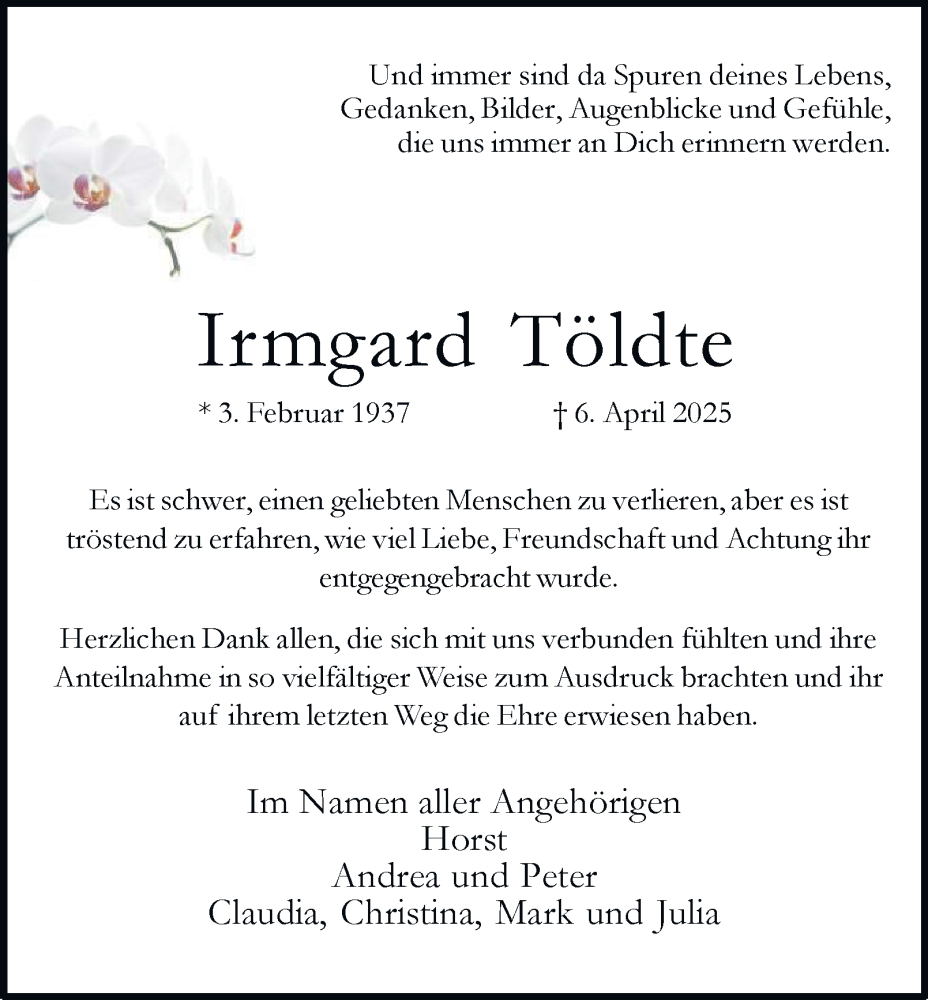 Hier finden Sie alle Traueranzeigen aus der Zeitung, die bisher für Irmgard Töldte erschienen sind. Weitere Traueranzeigen, die in der Zeitung erscheinen, werden hier ebenfalls aufgelistet
