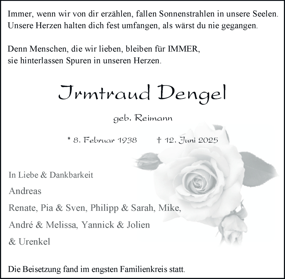 Hier finden Sie alle Traueranzeigen aus der Zeitung, die bisher für Irmtraud Dengel erschienen sind. Weitere Traueranzeigen, die in der Zeitung erscheinen, werden hier ebenfalls aufgelistet