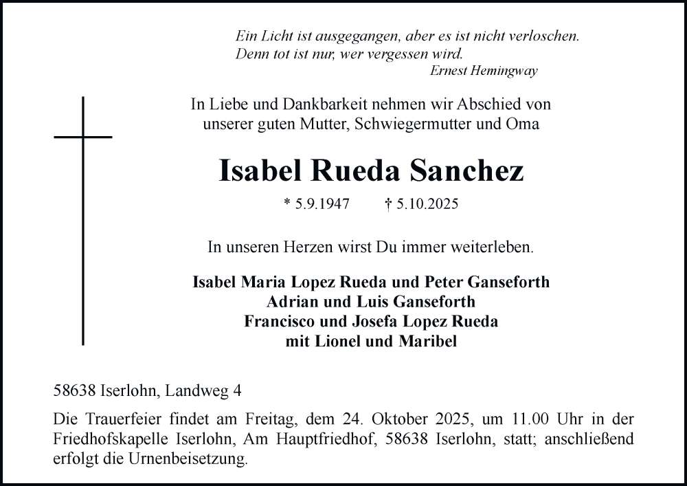 Hier finden Sie alle Traueranzeigen aus der Zeitung, die bisher für Isabel Rueda Sanchez erschienen sind. Weitere Traueranzeigen, die in der Zeitung erscheinen, werden hier ebenfalls aufgelistet