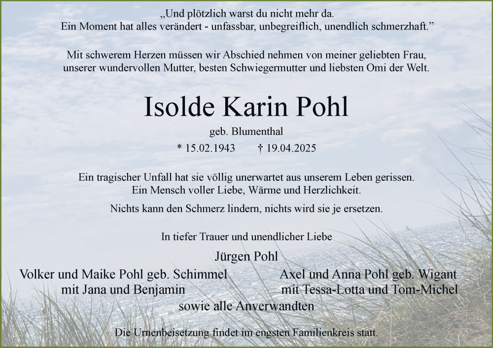 Hier finden Sie alle Traueranzeigen aus der Zeitung, die bisher für Isolde Karin Pohl erschienen sind. Weitere Traueranzeigen, die in der Zeitung erscheinen, werden hier ebenfalls aufgelistet