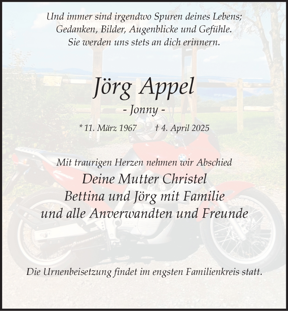 Hier finden Sie alle Traueranzeigen aus der Zeitung, die bisher für Jörg Appel erschienen sind. Weitere Traueranzeigen, die in der Zeitung erscheinen, werden hier ebenfalls aufgelistet