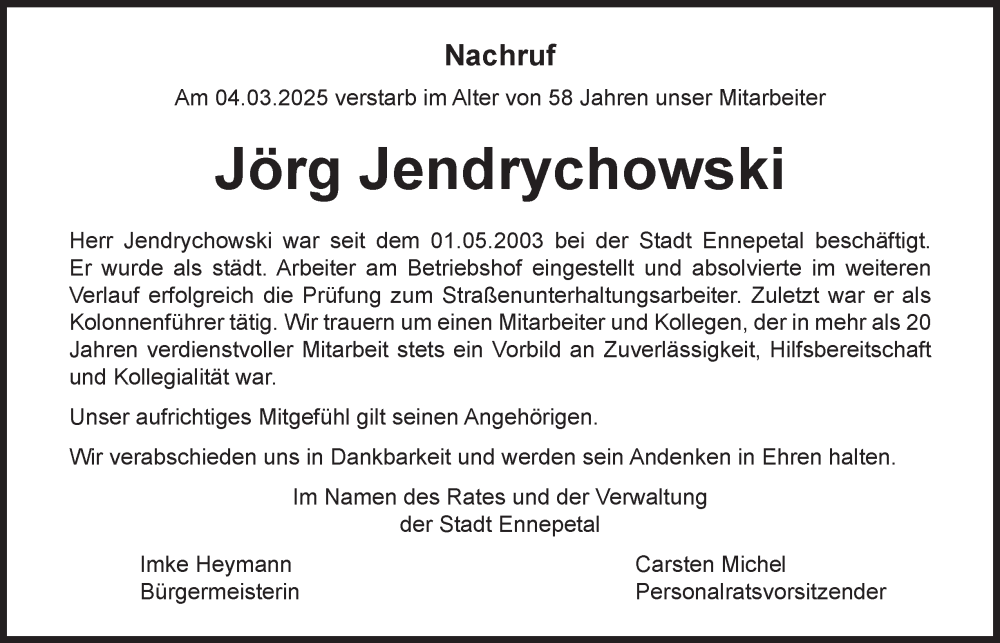 Hier finden Sie alle Traueranzeigen aus der Zeitung, die bisher für Jörg Jendrychowski erschienen sind. Weitere Traueranzeigen, die in der Zeitung erscheinen, werden hier ebenfalls aufgelistet