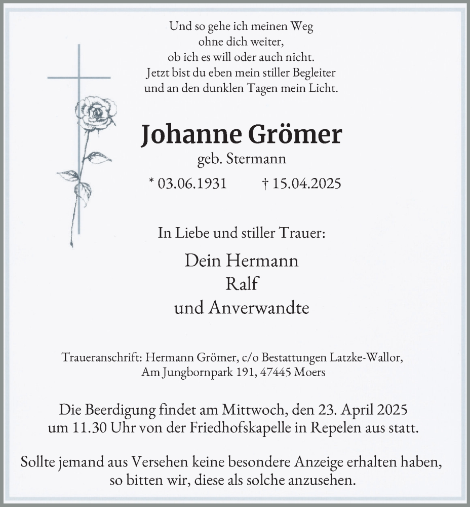 Hier finden Sie alle Traueranzeigen aus der Zeitung, die bisher für Johanne Grömer erschienen sind. Weitere Traueranzeigen, die in der Zeitung erscheinen, werden hier ebenfalls aufgelistet